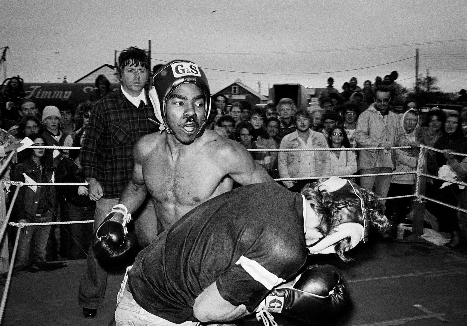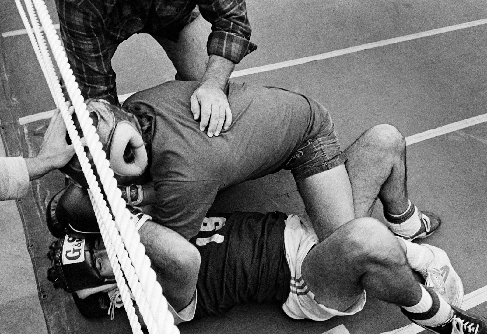 Through the ropes! Steve Houseknecht and Mike Ushko mixing it up. Fight judge, Pat Sweeney, seated center.
